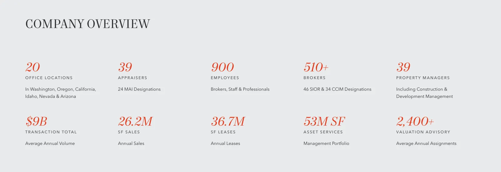 We know the Western U.S. In fact, we’re its largest fully independent commercial real estate firm. Our team boasts over 900 local market specialists and top-producing professionals—serving out of 20 offices in Washington, Oregon, California, Idaho, Nevada, and Arizona. The expertise of each local office is reinforced by the relationships, intelligence, and experience of our entire firm.